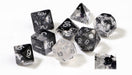 Stylized spades float in layers of glittering clear and black resin. Set of 7 polyhedral dice plus 1 extra D20. Packaged in a flat-bottom tube, so you can easily carry and store your dice.