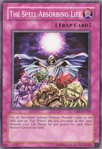 Flip all face-down Defense Position Monster Cards on the field face-up. Flip Effects are not activated at this time. Increase your Life Points by 400 points for each Effect Monster Card on the field.